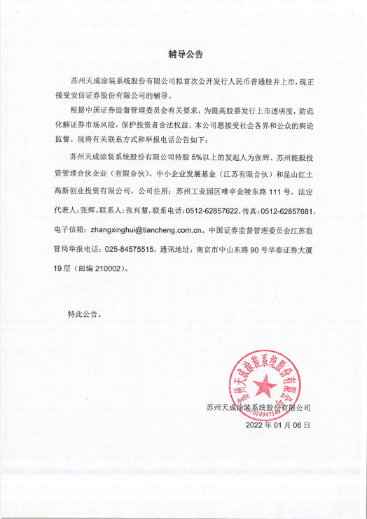 蘇州天成涂裝系統(tǒng)股份有限公司擬首次公開發(fā)行人民幣普通股并上市,現(xiàn)正接受安信證券股份有限公司的輔導。